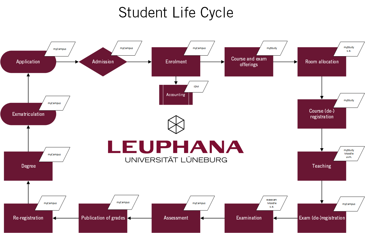 myCampus is the new campus management system at Leuphana. It maps all stages of the student life cycle and in this context serves the digital handling of tasks by applicants, students, examiners and administrative staff. The system can be accessed at the web address mycampus.leuphana.de.